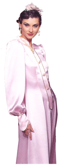 緞面長禮服,前襟過腰,釘別緻鈕扣,袖長蓋過手掌三分之二,高雅有韻味。海洋藍、粉紅及乳白三種色系,分別搭配不同顏色的裡布。