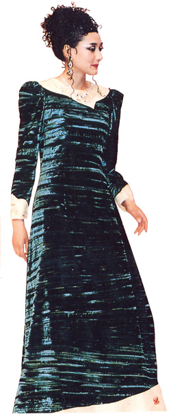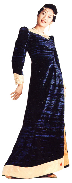 質料採用竹子壓花絲絨,色彩有藍、黑、綠、暗紅,在領口、袖口、下擺配上不同的金蔥布並罩上一層古典緹花紗,有立體效果,裙擺採斜線剪裁。
