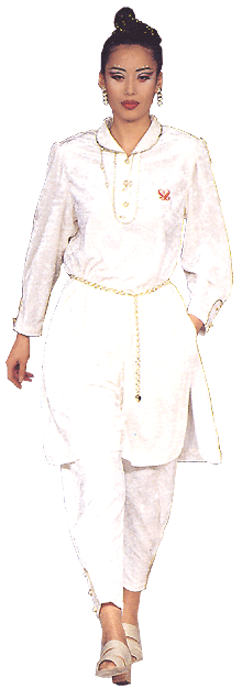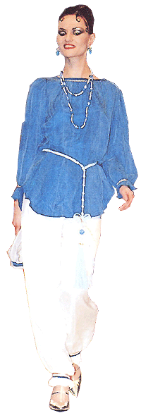 高雅的藍與純潔大方的白所搭配互補,特殊荷葉手袖與褲角獨特的裁剪設計,充分展現出女性嬌羞可愛的風姿,寬鬆的水洗絲上衣與厚緞的長褲可使女性在外出時展現輕鬆活潑的一面,加上中國古典腰飾的搭配,令人在悠遊自在中不失典雅的氣質。