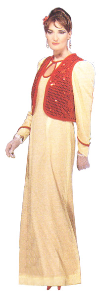 柔和的鵝黃、粉紅與水藍數款,胸前挖一圓孔,迷人又富創意,外罩齊腰短背心,背心有二組:鑲上亮片適合晚宴、華麗耀眼;平常時穿著的背心則不鑲亮片,高貴大方。