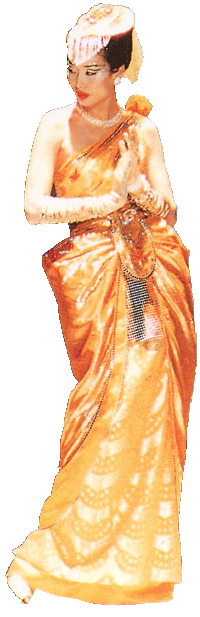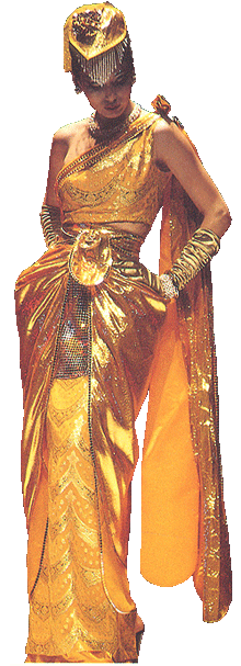 取自古代泰國服,金碧輝煌,單肩與截腰的設計顯得明快活潑,利用多種不同質料與質感的金黃布採多層疊法及自然垂褶,立體感十足,有活力的感覺。雖然採層次設計卻配合得當,不互相衝突。剪裁以圓弧為主,烘托女性的溫婉,手臂上配件平衡整體設計。頭飾古典又俏麗的造型予人高貴快樂的感覺!喚起昔日快樂的黃金時代,每位女性都是快樂的公主。
