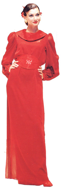 高貴柔和的及地無袖長衫,外罩薄紗,寬邊軟腰帶襯托腰部曲線更動人,適合往上梳的髮型。黑、寶藍、暗紅、藍紫。