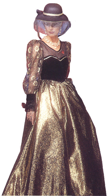 黑色為主調,細網低胸之設計,強調女性曲線美,又不失高貴氣度。大方的蕾絲蓬袖、亮麗的金蔥大蓬裙,以平衡黑色的深沉,是運用陰陽平均之傑出設計。