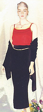 are slits on both sides of the fitted long skirt. The contrasting