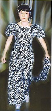 High-waist dress made of light blue silk fabric with light blue floret pattern on it.