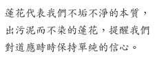 ◆「我們必須住在這個誘惑與掙扎的世界,但又必須持戒,不被污染,就像蓮花生於污泥之中,卻又那麼純淨芳香,我們就是要像那樣成為地獄裡的聖人。」