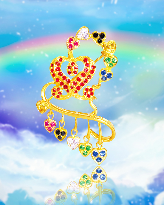 The classic S.M. logo adorns the Global Family brooch encircled by heart-shaped gemstones of kaleidoscopic colors representing people of different races, the animal and plant kingdoms and the elements of the natural world. The design signifies that all beings are members of a single global family who are connected heart-to-heart and united as One, in spirit without discrimination, as they live and grow in God’s glory!